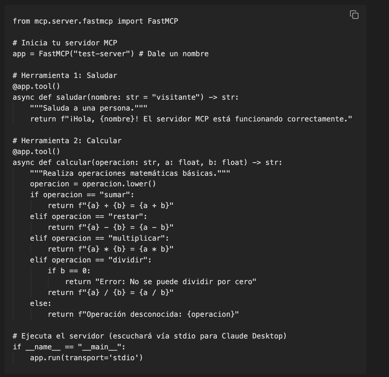 Crea un archivo llamado test_server.py y pega el código Python. Este servidor tendrá una herramienta simple para saludar y hacer cálculo simples.